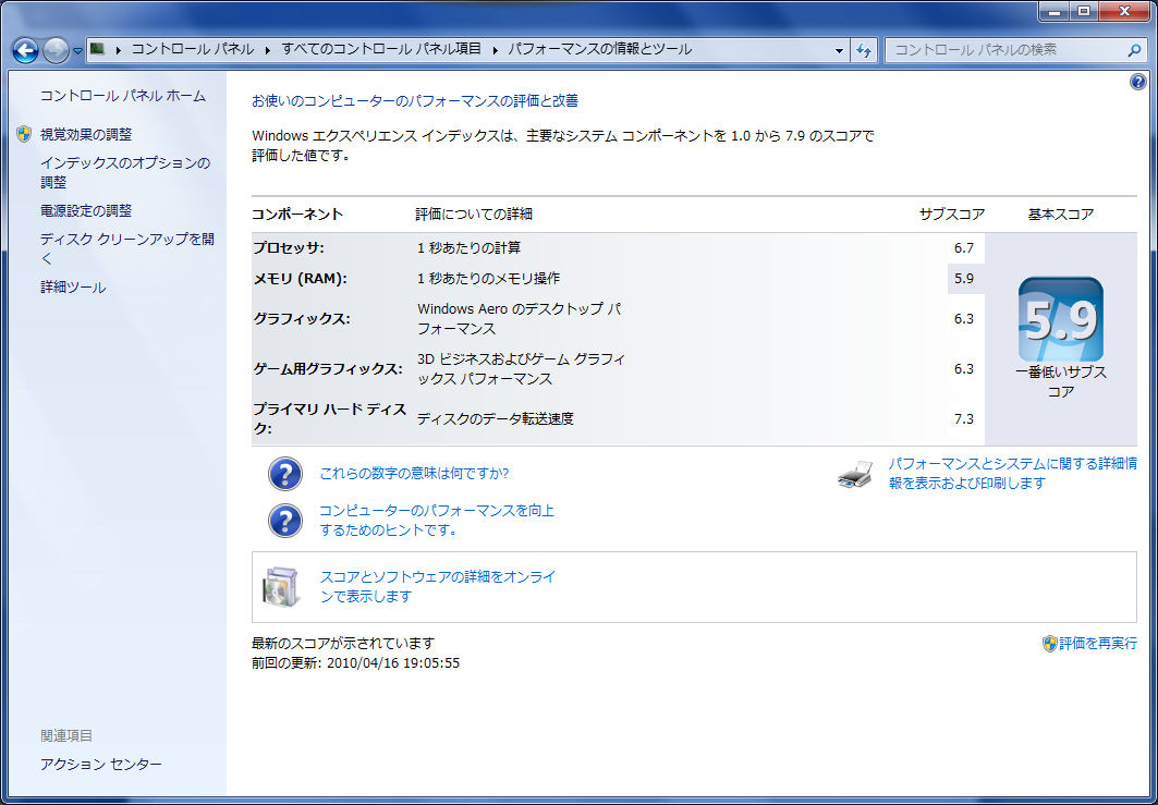 Windowsエキスペリエンスインデックス。Intel HM57Expressチップセットで搭載できるPC3-5300では、この5.9が限界らしいので、そこが数字的には低いが相対的には全体の足をひっぱるような数値ではないと思われるので、どこかをチューニングしたくなるが、RAID0によるツインSSD構成なのでディスクはいじる必要がなさそうだ。どこもいじるところがない。なんかつまらない